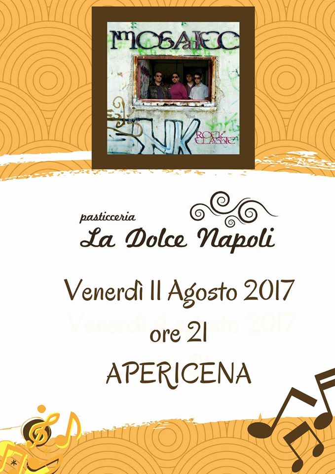 MESSAGGIO PROMOZIONALE – Prosegue l’estate della Pasticceria ‘La Dolce Napoli’. A grande richiesta, in via Nobile a Campobasso, per un’altra grande serata all’interno delle iniziative promosse per il mese di agosto, il prossimo venerdì 11, torna l’apericena con la band ‘Mosaico’, gruppo composto da: Valeriano Zaccaro alla chitarra, Massimiliano Evangelista voice, Riccardo Scinocca alla batteria e Daniele Capra al basso.