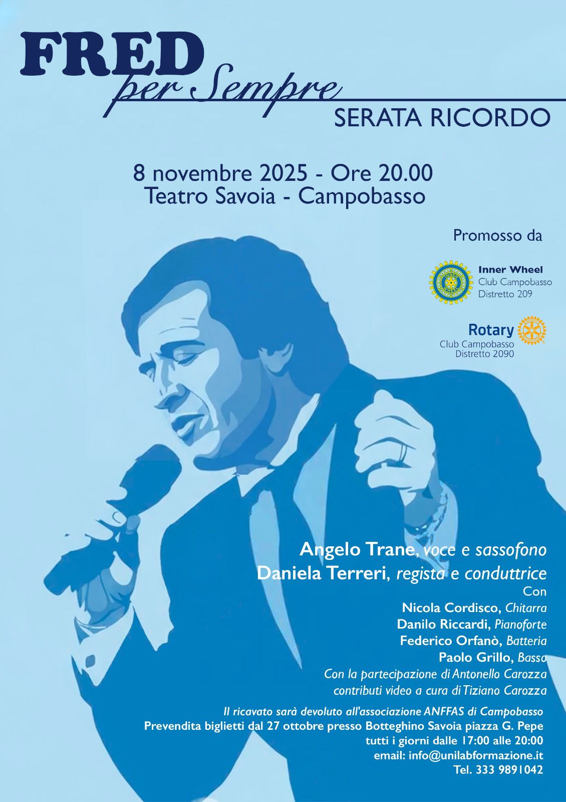 L’Inner Wheel Club di Campobasso, giovane ma già attivissima realtà impegnata nel sociale, insieme al Rotary Club di Campobasso, da settant’anni punto di riferimento culturale sul territorio, promuovono “FRED PER SEMPRE”, una serata musicale dedicata al crooner che fece sognare l’Italia.