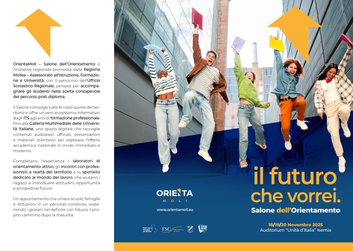 La Regione Molise – Assessorato all’Istruzione, Formazione e Università, con il patrocinio dell’Ufficio Scolastico Regionale del Molise, promuove il progetto “OrientaMolì”, un’importante iniziativa regionale dedicata all’orientamento formativo e professionale dei giovani molisani, con l’obiettivo di accompagnarli nella costruzione consapevole del proprio percorso post-diploma.