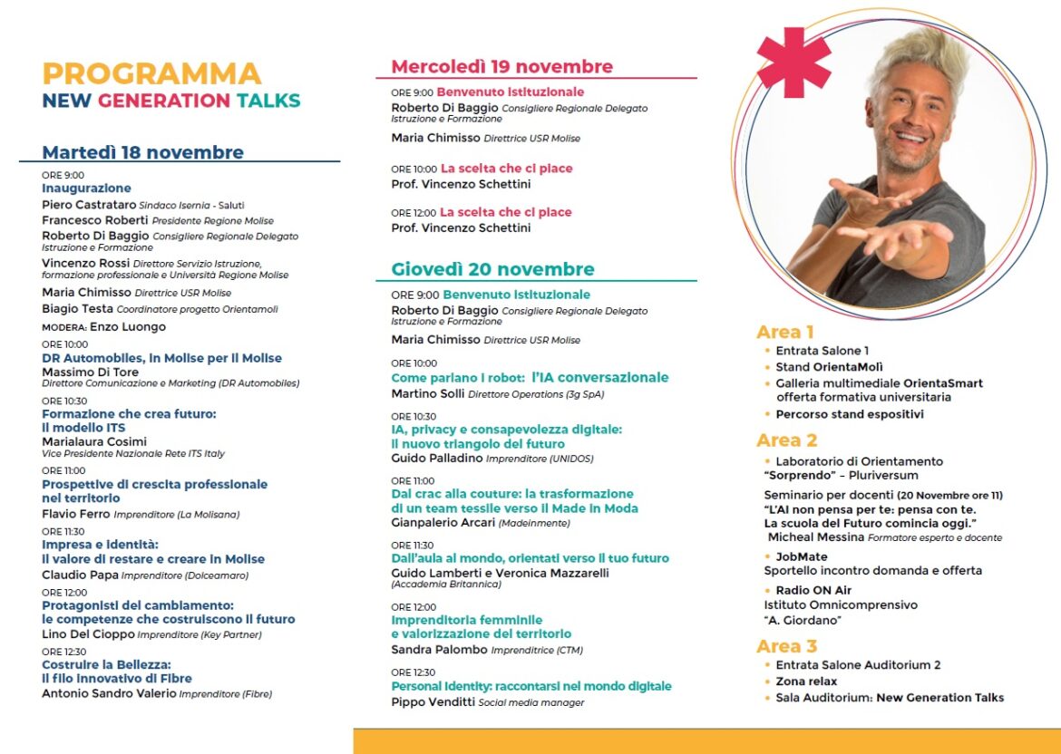 Il momento centrale dell’iniziativa sarà rappresentato dal Salone dell’Orientamento “OrientaMolì”, che si terrà presso l’Auditorium “Unità d’Italia” di Isernia nelle giornate del 18, 19 e 20 novembre 2025 dalle ore 9.00 alle ore 14.00.