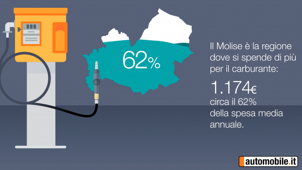 Tra i fattori che compongono la spesa annua, l’incidenza più ampia è quella del carburante, che influisce per il 53% sui costi complessivi. La regione dove la spesa per il carburante è più alta è il Molise (1.174 euro), non solo per il costo dello stesso ma anche per il numero medio di chilometri percorsi ogni anno. Il Friuli Venezia Giulia è ancora una volta tra le regioni più “economiche”, insieme a Sicilia, Lazio, Liguria, Marche e Valle d’Aosta, tutte sotto i 700 euro di media all’anno.