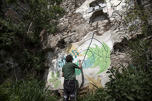 CHI È GOLA – Ma chi è lo street artist con cui si è aperto il CVTà Street Fest 2017 e che tanto interesse ha suscitato al suo arrivo? Gola Hundun nasce a Cesena nel 1982 e attualmente vive e lavora tra Rimini e Barcellona. La sua ricerca affonda le radici in una profonda riflessione sulla relazione simbiotica ma conflittuale tra l’essere umano e la biosfera. Questa analisi, unita alla conscia decisione di divenire vegetariano all’età di sedici anni, porta l’artista e la sua poetica a essere più vicini alla sfera animale che a quella umana. Esplora temi come coesistenza, ecologia, sciamanesimo, ritorno alla terra, vegetarianesimo e spiritualità. Gola si forma al liceo artistico di Ravenna e all’Accademia di Belle Arti di Bologna; approda alla street art giovanissimo, appena dodicenne, e perciò ben prima degli studi accademici, attraverso le esperienze fatte con i graffiti tradizionali. Quando nel 2004 si trasferisce a Barcellona, la scena della street art locale influenza fortemente il suo segno e lo spinge nuovamente a relazionarsi con lo spazio pubblico. Nel tempo, il suo lavoro porta Gola a visitare diversi paesi realizzando progetti e mostre collettive e personali a San Paolo in Brasile, Jenin in Palestina, Mosca in Russia, Tokyo in Giappone, Almaty in Kazakhstan e recentemente a Miami in USA e a Santo Domingo in Repubblica Dominicana. L’universo visivo che Gola Hundun crea ha sempre un’interpretazione allegorica e si nutre di diverse influenze e delle tante culture che ha incontrato e continua a incontrare durante i suoi viaggi. Parallelamente al fare pittorico, che si esercita sia su supporti tradizionali che su parete, Gola crea installazioni nel contesto dello spazio pubblico, incorporando materiali naturali, tessuti, piante vive, luci, e live performance.