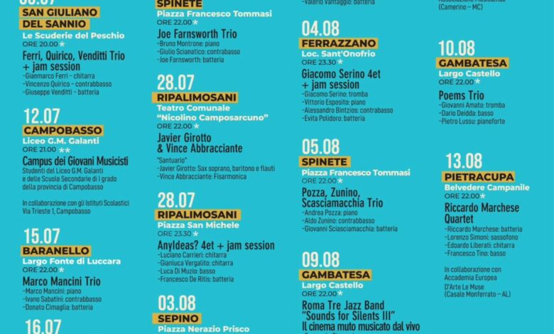 Il Molise è diventata da anni una tappa importante per la conoscenza del mondo Jazz, soprattutto grazie all’associazione Borgo in Jazz che nella sua decima edizione offre al pubblico numerosi concerti nel mese di agosto: il 5 agosto tappa a Spinete con il brillante trio formato da Andrea Pozza, Aldo Zunino e Giovanni Scasciamacchia. Il 9 agosto il festival arriva a Gambatesa:alle ore 22.00 si terrà un evento in collaborazione con la Fondazione Roma Tre Teatro Palladium: il concerto della Roma Tre Jazz Band per il progetto “Sound for Silents III – Il cinema muto musicato dal vivo”. Seguirà l’esibizione del musicista vincitore del Premio Massimo Urbani 2023: un live organizzato in collaborazione con l’Associazione Musicamdo di Camerino. Il 10 agosto si rimane a Gambatesa con il Poems Trio formato da altre tre eccellenze del panorama jazz nazionale: Giovanni Amato, Dario Deidda e Pietro Lussu. Il 13 agosto ultima tappa della X edizione del festival, nel suggestivo borgo di Pietracupa: concerto del Riccardo Marchese Quartet in collaborazione con l’Accademia Europea d’Arte Le Muse.
