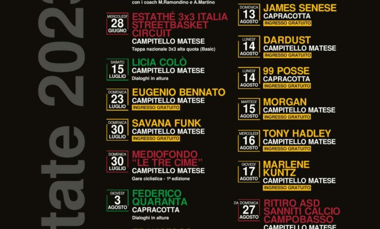 Oltre ai numerosi eventi del mese di luglio, ad agosto i concerti più importanti partono dal 12 a Campitello Matese con Filippo Graziani e il suo Arcipelago Ivan: un omaggio di Filippo Graziani al padre che porterà gli spettatori tra musica, racconti e letture per rivivere i grandi successi di casa Graziani, le canzoni dell’esordio e i lato B dei dischi più famosi per scoprire nuove curiosità sul primo cantautore rock italiano. Musica e tecnologia si uniscono il 14 agosto per il Duality Tour 2023 di Durdust che fa tappa a Campitello Matese. Montagna Molise si sposta a Capracotta per James Senese il 13 agosto con il suo inconfondibile stile jazz-blues. A seguire, il 14 agosto in località Prato Gentile si potrà assistere al concerto dei 99 posse. Il 17 agosto, tornando a Campitello Matese, sarà la volta dei Marlene Kuntz, attesissimo concerto della band italiana che trasporta il pubblico in un viaggio sonoro unico, combinando melodie potenti con testi profondi e ricchi di significato. La loro energia contagiosa e le esibizioni travolgenti catturano l’attenzione di tutti, creando un’atmosfera di pura magia rock. Tutti gli eventi del cartellone sono disponibile al sito: https://www.montagnamolise.com/eventi/