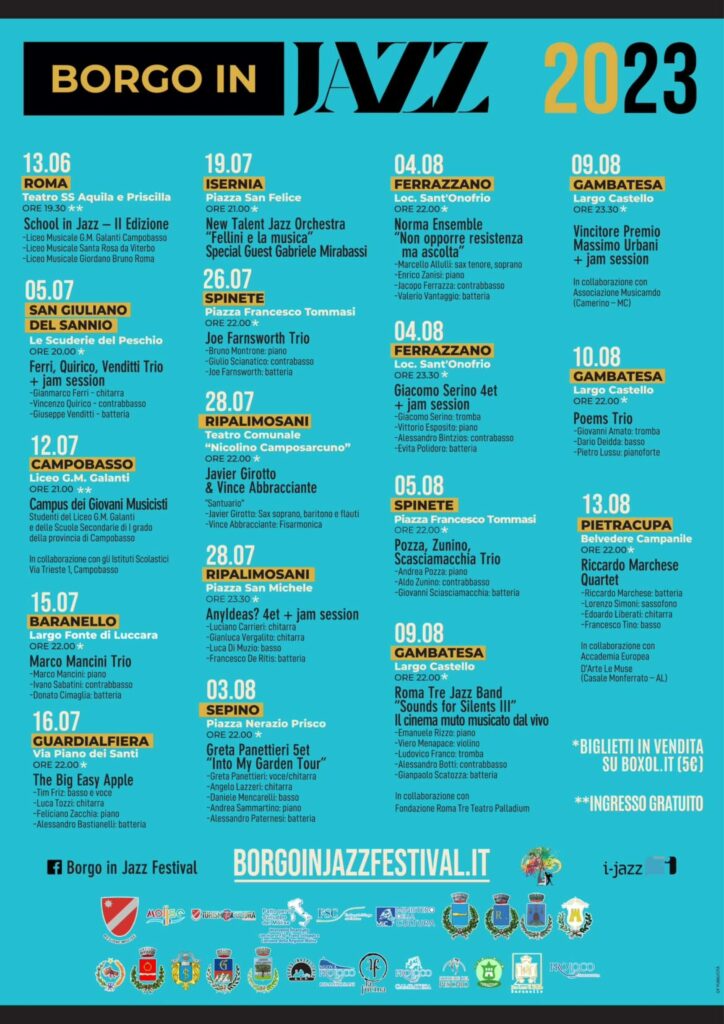 Il Molise è diventata da anni una tappa importante per la conoscenza del mondo Jazz, soprattutto grazie all’associazione Borgo in Jazz che nella sua decima edizione offre al pubblico numerosi concerti nel mese di agosto: il 5 agosto tappa a Spinete con il brillante trio formato da Andrea Pozza, Aldo Zunino e Giovanni Scasciamacchia. Il 9 agosto il festival arriva a Gambatesa:alle ore 22.00 si terrà un evento in collaborazione con la Fondazione Roma Tre Teatro Palladium: il concerto della Roma Tre Jazz Band per il progetto “Sound for Silents III – Il cinema muto musicato dal vivo”. Seguirà l’esibizione del musicista vincitore del Premio Massimo Urbani 2023: un live organizzato in collaborazione con l’Associazione Musicamdo di Camerino. Il 10 agosto si rimane a Gambatesa con il Poems Trio formato da altre tre eccellenze del panorama jazz nazionale: Giovanni Amato, Dario Deidda e Pietro Lussu. Il 13 agosto ultima tappa della X edizione del festival, nel suggestivo borgo di Pietracupa: concerto del Riccardo Marchese Quartet in collaborazione con l’Accademia Europea d’Arte Le Muse.