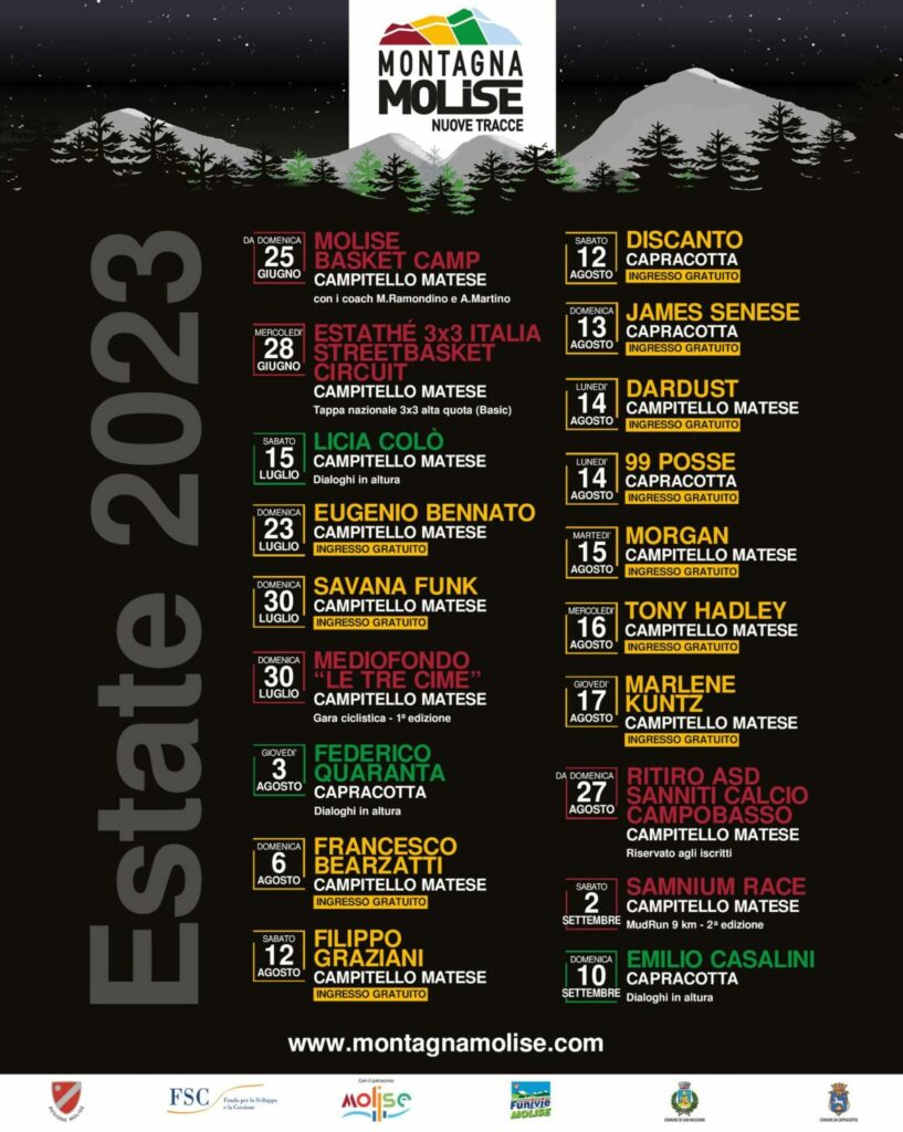 La novità dell’estate 2023 che ha lasciato a bocca aperta per un cartellone colmo di grandi eventi e nomi importanti è quella di Montagna Molise. Come si legge del sito ufficiale: “Il Progetto Montagna Molise nasce per valorizzare, destagionalizzare e far conoscere ad un vasto pubblico la bellissima montagna molisana, con i suoi comprensori di Campitello Matese e Capracotta. ‘Nuove Tracce’ ci condurranno lungo sentieri, boschi e piste innevate, alla scoperta delle tradizioni, dello spirito e dei saperi di questi territori, tracce in movimento che scandiscono il tempo di oggi e guardano al futuro.”