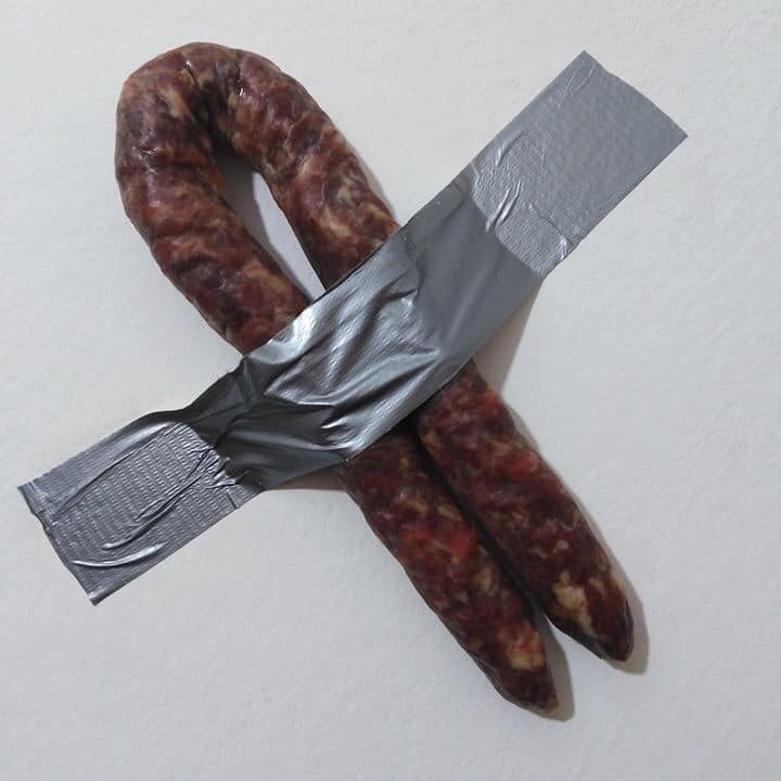 La banana mantenuta al muro con il nastro adesivo è stata, infatti, sostituita con una salsiccia piccante del territorio riccese.