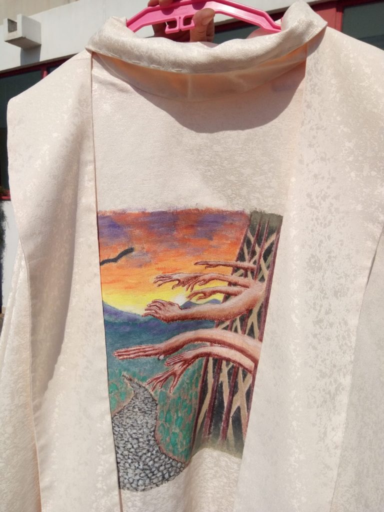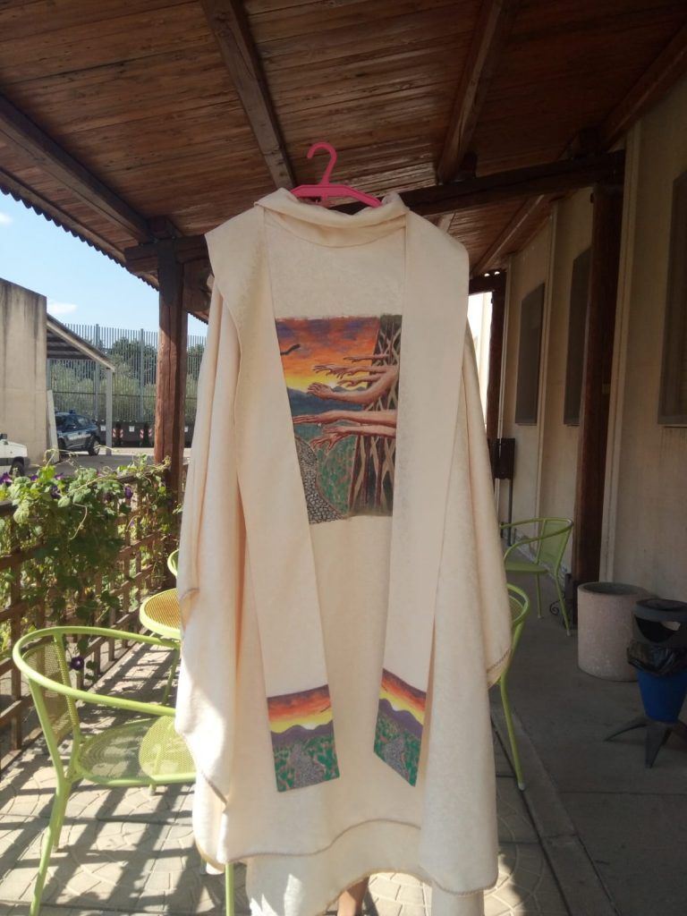 In modo particolare, sulla casula, hanno voluto rappresentare visivamente la sofferenza della condizione detentiva, accompagnando le immagini delle mani protese con un messaggio di speranza e di fiducia per il futuro.