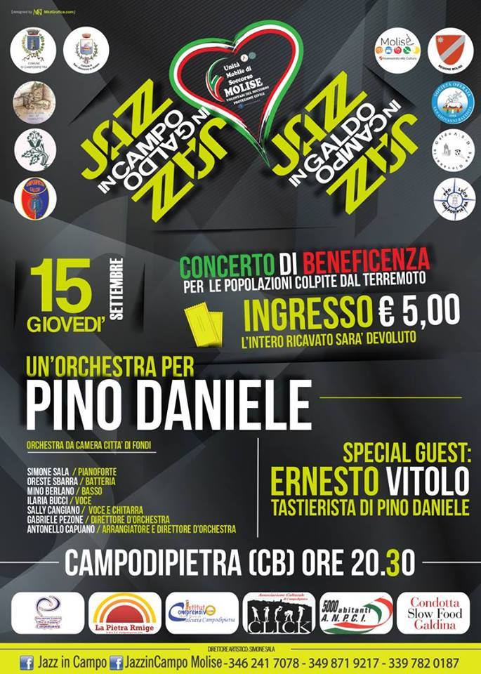 “Noi di ‘Jazz in Campo Jazz in Galdo’ – le parole del musicista Simone Sala – insieme ai Comuni di Campodipietra e di San Giovanni in Galdo, con l’interessamento dei sindaci Peppe Notartomaso e Mario Piunnio, del vice-sindaco di Campodipietra, Gianluca Cefaratti, al presidente dell’associazione culturale ‘Amici del Morrutto’, Stefano Trotta, e col sostegno del consigliere regionale, delegato alla Cultura, Nico Ioffredi, abbiamo messo in piedi un evento, che nel 2014 riscosse un grandissimo successo: l’omaggio a Pino Daniele. Siamo riusciti a mettere insieme un’orchestra di quattordici archi, quattro fiati, due voci soliste, due direttori, l’arrangiatore Antonello Capuano, e il direttore stabile dell’Orchestra da Camera di Fondi, Gabriele Pezone, una sezione ritmica con Mino Berlano al basso ed Oreste Sbarra alla batteria. Una trentina di persone che saranno capitanate da Ernesto Vitolo. Un grazie – ha chiosato Simone Sala – va a tutte le associazioni presenti sul territorio, che si sono messe a disposizione per il fine benefico e di solidarietà”.