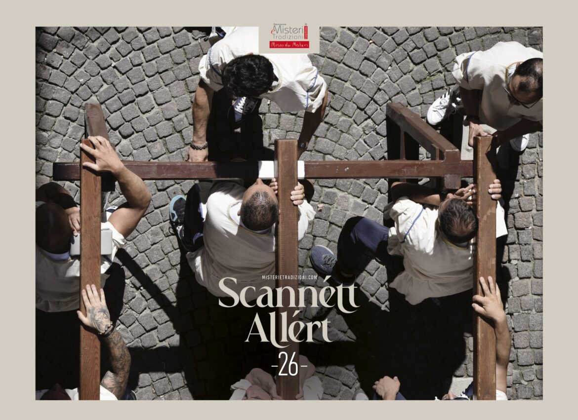 Quest’anno l’omaggio va agli scannetti e, naturalmnete, ai portatori. Chini, le mani serrate sul legno scuro, i volti segnati da fatica e devozione: è un coro silenzioso, che non canta con la voce ma con il peso condiviso. ll Calendario dei Misteri 2026 quest’anno ha un titolo che sa di richiamo d’epoca: “Scannètt Allèrt”. Lo scannetto non è un mobile Ikea, bensì lo strumento fondamentale che aiuta i portatori a sopravvivere alla maratona della giornata. E “Scannétt Allért!” è il grido del capo squadra per dare il via al sollevamento del Mistero. Una specie di “3, 2, 1… via!”, anche se molti lo confondono e fanno un po’ di casino con l’ordine.