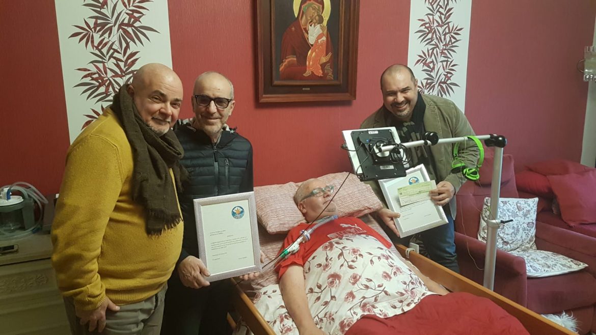 La consegna a casa del presidente di ‘MoliRARI’, da dove Antonio Tartaglia, grazie all’ausilio del suo inseparabile tablet, grida al mondo intero la sua voglia di vivere e quella di combattere per i diritti di chi, solo apparentemente, non ha la forza di parlare. Ma gli sguardi di Antonio, simbolo dei malati di Sla in Molise, valgono più di centomila parole.