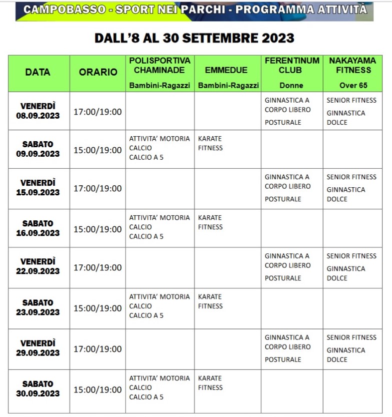 ‘Sport di TUTTI – Parchi‘, ideato da Sport e Salute S.p.a., la società dello Stato per la promozione dello sport e dei sani stili di vita, in collaborazione con Anci (Associazione Nazionale Comuni Italiani) e il Comune di Campobasso, l’8 settembre 2023 ripartirà con le attività di ‘Urban Sport Activity e Weekend’ a Campobasso.
