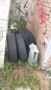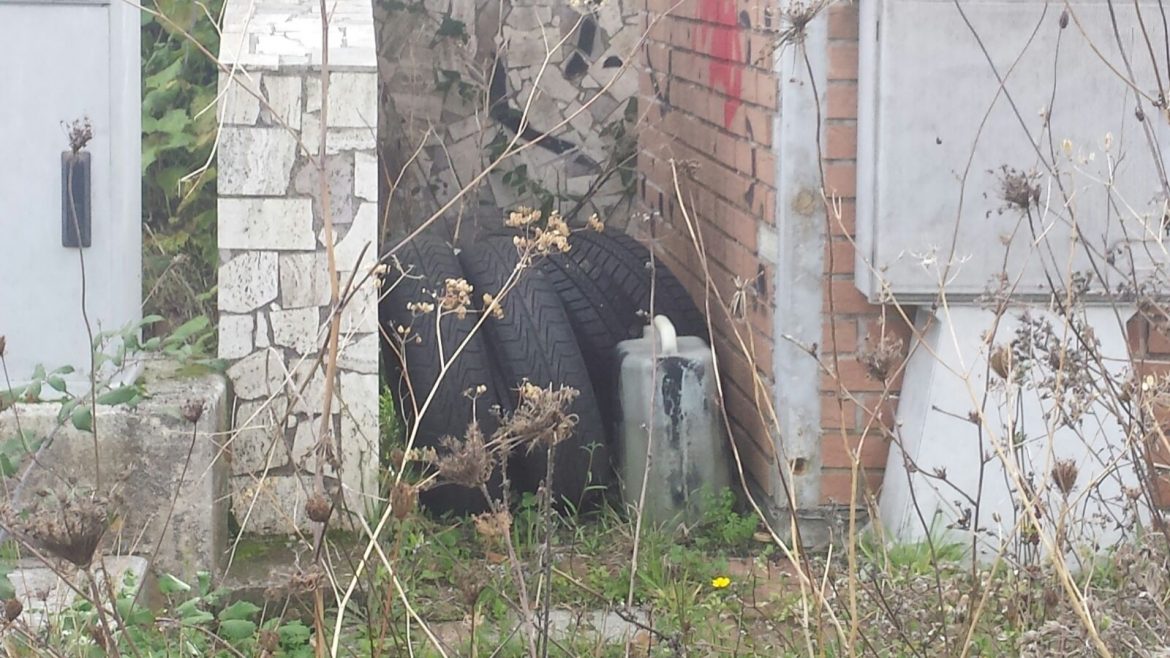 Pneumatici abbandonati e accuratamente nascosti tra due muretti adiacenti ai palazzi Falcione in costruzione, lungo la salita di contrada Cese nei pressi dell’acquedotto di Campobasso.