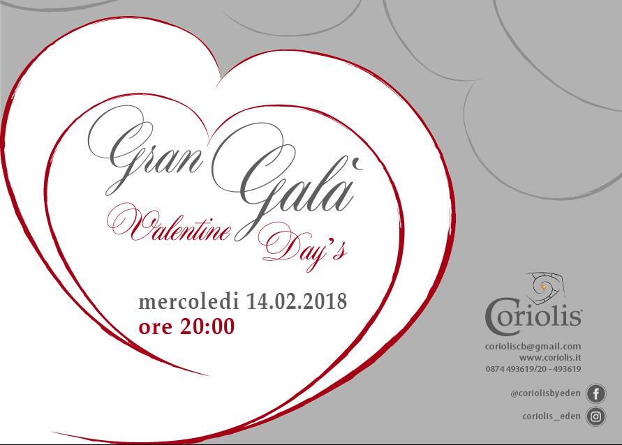 MESSAGGIO PROMOZIONALE – Andare fuori a cena in occasione della festa degli innamorati è un un’idea romantica e senza dubbio il miglior modo per trascorrere del tempo con il proprio partner. L’importante è non sbagliare ristornate e menù. Ecco perché, in occasione della festa dedicata a chi si ama, il Coriolis propone Il Gran Galà Valentine Day’s.