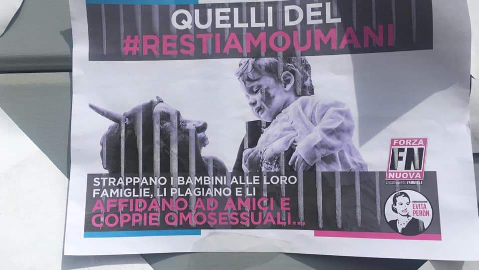 Il diavolo dei Misteri di Campobasso che, in occasione della tradizionale sfilata del giorno di Corpus Domini, prende in braccio una bambina è stata l’immagine utilizzata sui manifesti corredati dalla scritta: “Quelli del #restiamoumani, strappano i bambini alle loro famiglie, li plagiano e li affidano ad amici o a coppie omosessuali”.
