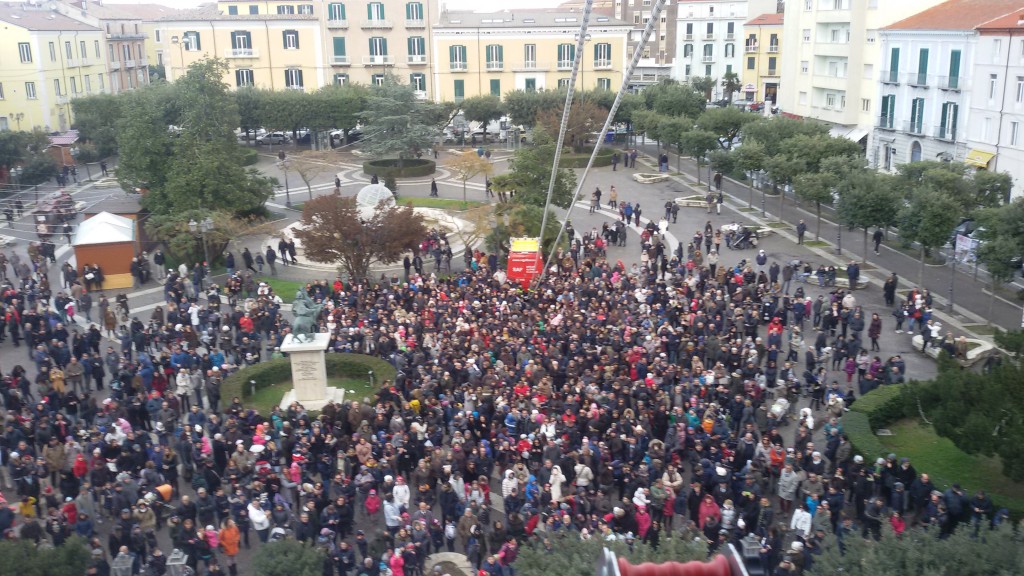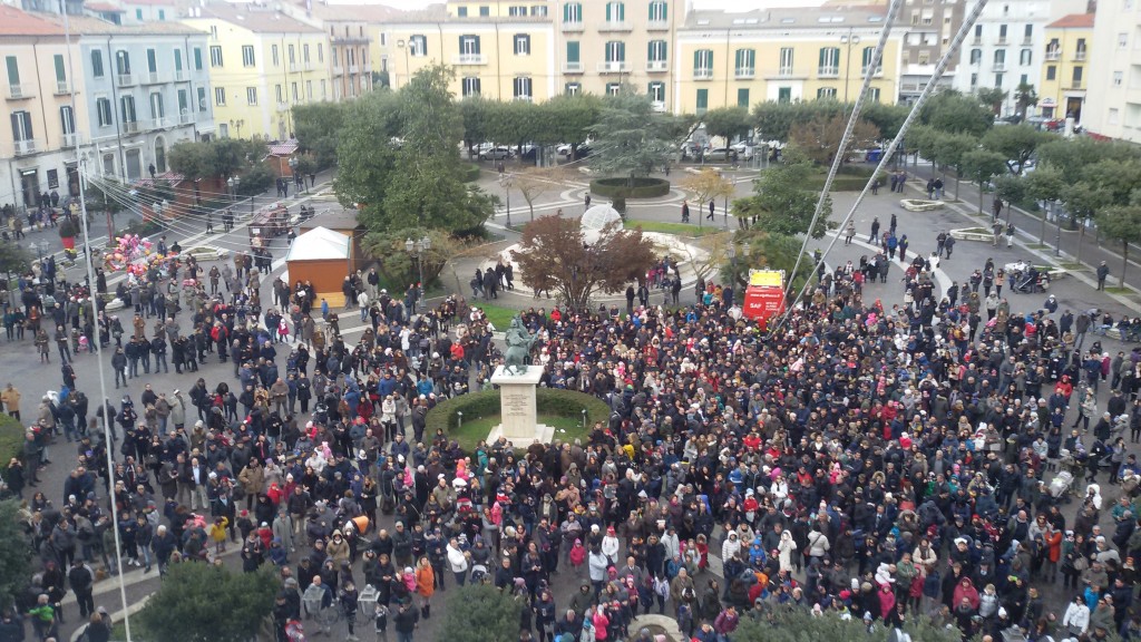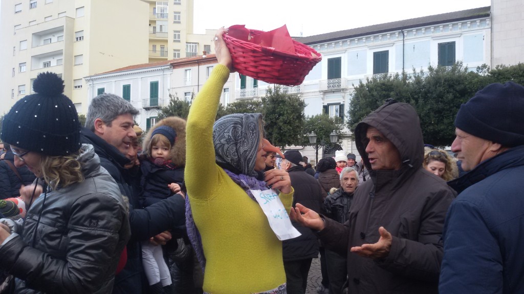 In tantissimi i bambini, accompagnati dai genitori, che questa mattina, mercoledì 6 gennaio 2015, per l’Epifania, hanno sfidato il freddo per assistere in piazza Vittorio Emanuele al tradizionale appuntamento della distribuzione di caramelle e dolcetti da parte della Vecchietta che arriva dall’alto con la scopa, per consegnare gioia e felicità nell’ultimo giorno delle festività natalizie.