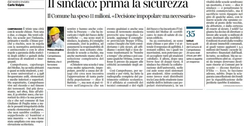 Campobasso è “una città triste con le scuole chiuse”. Inizia così l’articolo a firma del giornalista Carlo Vulpio a pagina 21 dell’edizione del Corriere della Sera di oggi, mercoledì 26 settembre 2018.