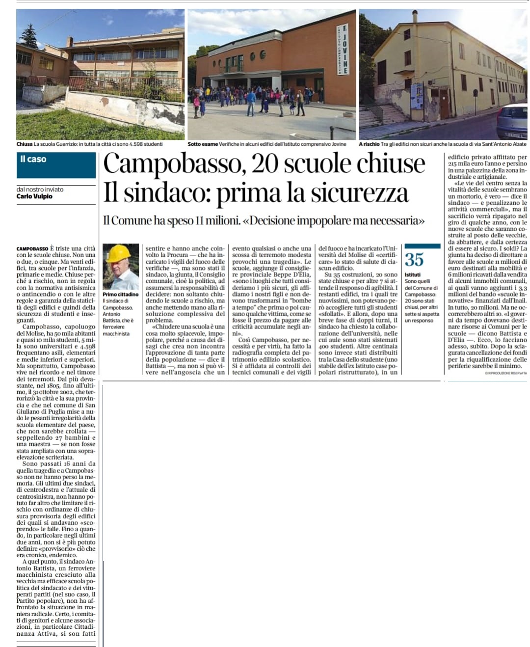 Campobasso è “una città triste con le scuole chiuse”. Inizia così l’articolo a firma del giornalista Carlo Vulpio a pagina 21 dell’edizione del Corriere della Sera di oggi, mercoledì 26 settembre 2018.