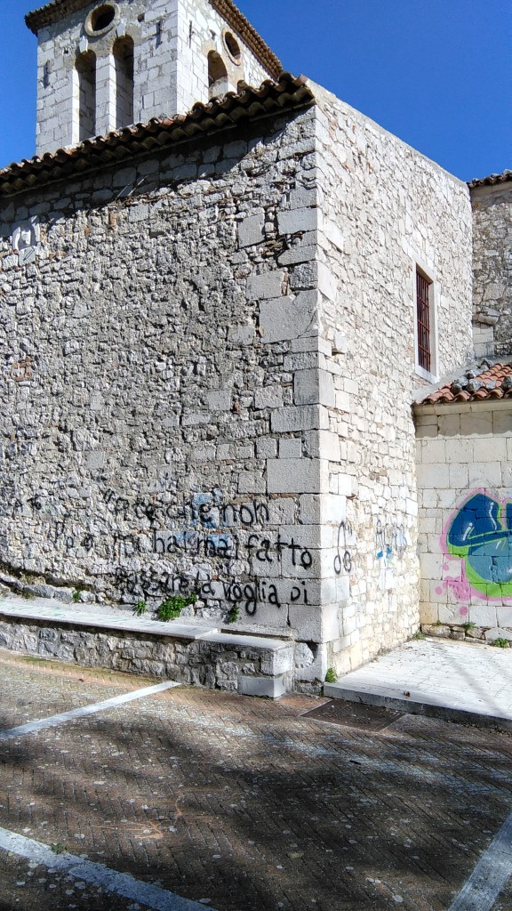 La chiesa di San Giorgio martire, risalente a un periodo tra l’undicesimo e il tredicesimo secolo, situata nella parte alta di Campobasso, insieme alla vicina Chiesa di San Bartolomeo e alla Torre Terzano nella sommità della collina Monforte, viene continuamente imbrattata da graffiti, tag e simboli di writers che, spesso e impunemente, deturpano edifici storici e pubblici con conseguenti atti di vandalismo.