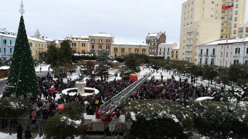 Nel corso della notte scorsa, Piazza Vittorio Emanuele è stata sgomberata dalla coltre bianca, per consentire a grandi a piccini della città di poter assistere al volo della vecchia con la scopa che, puntuale come ogni anno è arrivato alle 12. Modalità un pò differente rispetto a quella dello scorso anno che, per l’edizione del 2019, ha visto la vecchietta approdare sulla folla entusiasta con l’autoscala.
