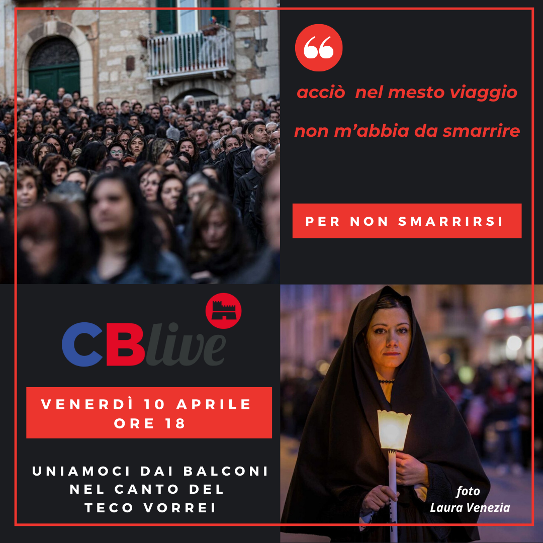 In virtù dell’amore e del legame che unisce i campobassani a un rito pasquale così sentito, la redazione di CBlive lancia all’intera città di Campobasso una proposta per chiedere a chiunque voglia partecipare di poter intonare alle 18 di venerdì 10 aprile 2020 il Teco Vorrei sul balcone della propria abitazione.