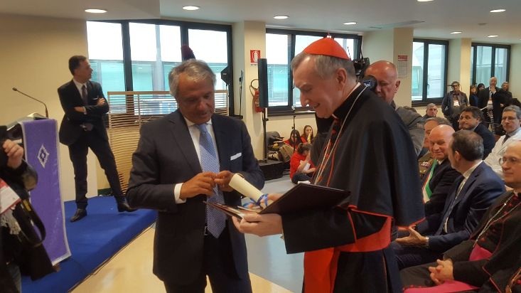 Dopo il suo intervento il presidente ha consegnato a Parolin una targa ricordo della giornata.