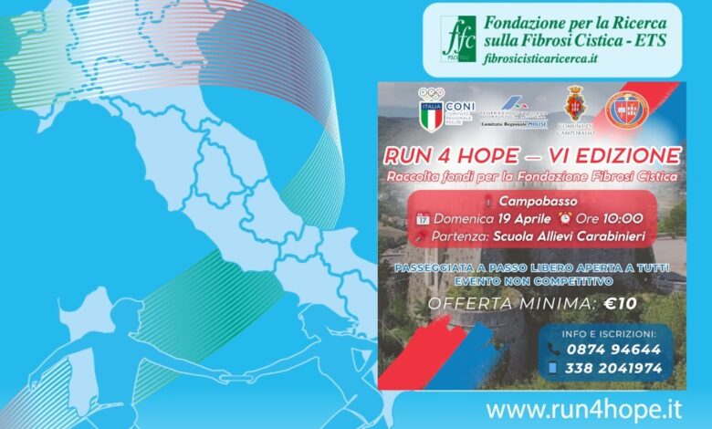Il Comitato Regionale Molise della FIDAL, con il patrocinio del CONI Molise sostiene e affianca il soggetto organizzatore a livello territoriale, nella realizzazione della sesta edizione della Run4Hope – Giro d’Italia podistico solidale, iniziativa nazionale promossa da Run4Hope Italia Onlus.