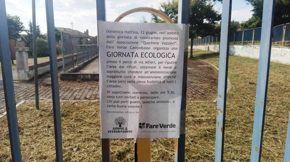 I volontari di Fare Verde erano pronti a ripulire il parco di via Alfieri a Campobasso. Come avevano annunciato gli ambientalisti nei giorni scorsi avrebbero, insieme ad alcuni migranti ospiti del capoluogo, risistemato “un’area abbandonata da circa 20 anni”. Ma questa mattina, domenica 12 giugno, quando i volontari si sono recati in via Alfieri hanno trovato “l’area rimessa a nuovo”. A raccontare la vicenda è l’attivista di Fare Verde, nonché consigliere comunale del Movimento 5 Stelle, Simone Cretella per il quale “quello compiuto dall’amministrazione è stato un intervento, tanto tardivo quanto provocatorio, fatto nella giornata di ieri dall’amministrazione, con il chiaro obiettivo di boicottare l’iniziativa di volontariato di oggi che era stata, peraltro, annunciata e concordata con la stessa amministrazione, impegnata nel fornire i sacchi per i rifiuti e ritirarli l’indomani”.