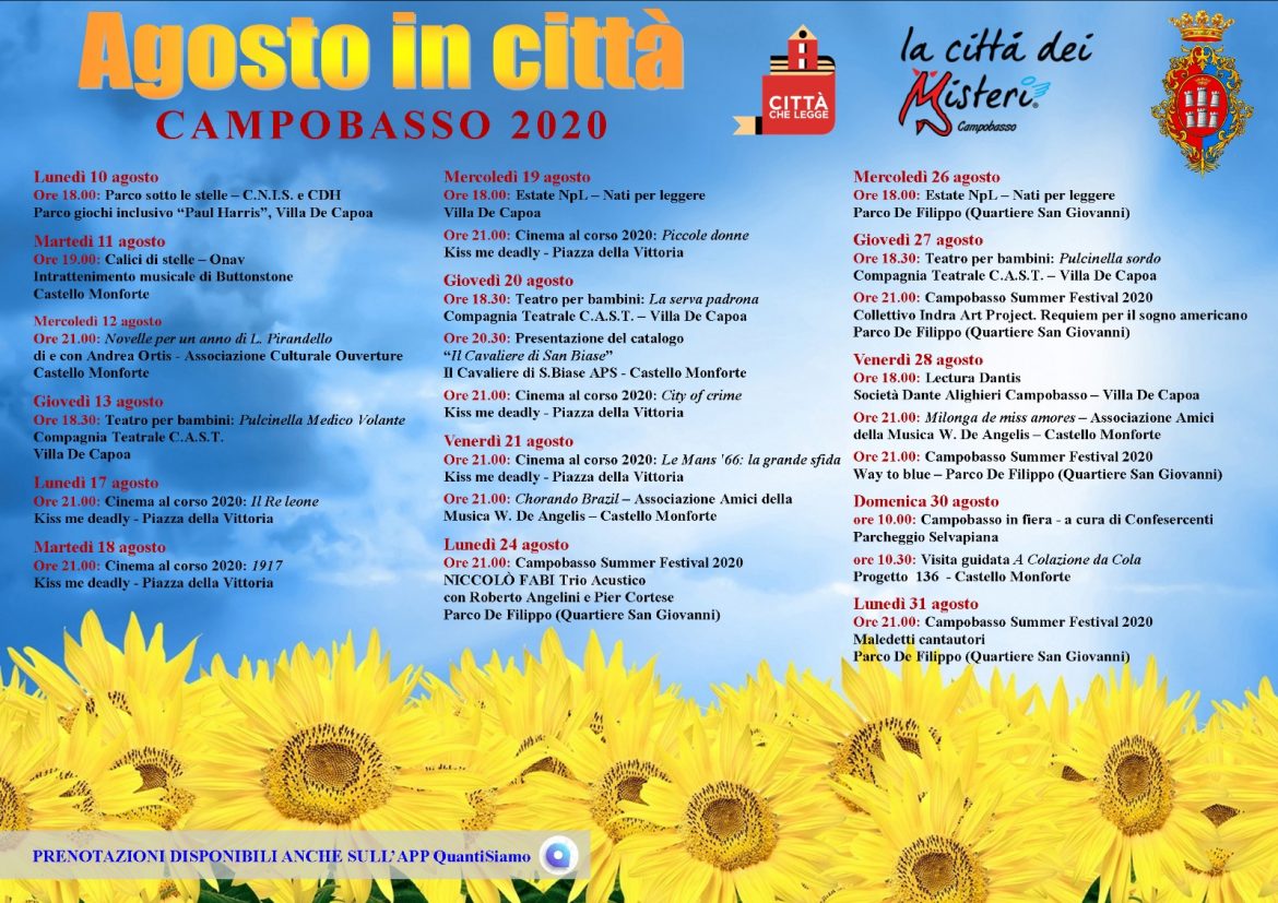Ma a partire proprio dal 10 agosto, saranno decine gli appuntamenti di diversa natura che sono pronti ad accogliere, sempre all’aperto e nel pieno rispetto delle regole stabilite dalle recenti linee guida, il pubblico campobassano di tutte le età.
