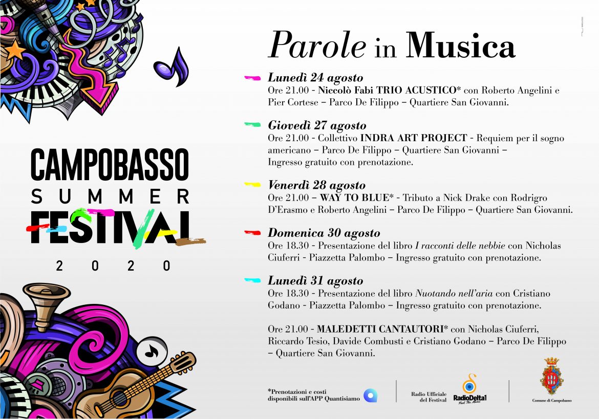 All’interno del “Campobasso Summer Festival” ci saranno anche due appuntamenti letterari, con la presentazione di due testi, entrambi a Piazzetta Palombo, ovvero, domenica 30 agosto, alle ore 18.30, Nicholas Ciuferri presenterà “I racconti delle nebbie”, mentre lunedì 31 agosto, sempre alle ore 18.30 – Cristiano Godano presenterà il suo libro “Nuotando nell’aria”.