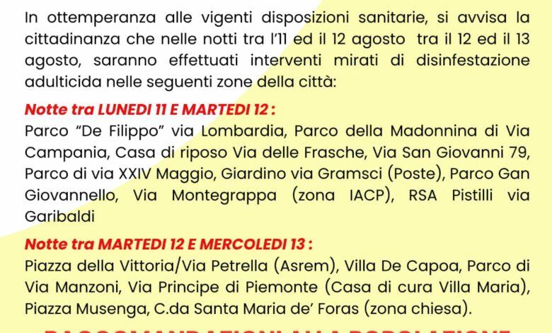 In seguito alle raccomandazioni diramate dall’ASREM per contrastare la diffusione del virus West Nile, recentemente riscontrato anche nella nostra regione in un pool di insetti nella provincia di Isernia, l’Amministrazione comunale di Campobasso informa che, nei prossimi giorni, saranno effettuati interventi mirati di disinfestazione adulticida in alcune aree della città.