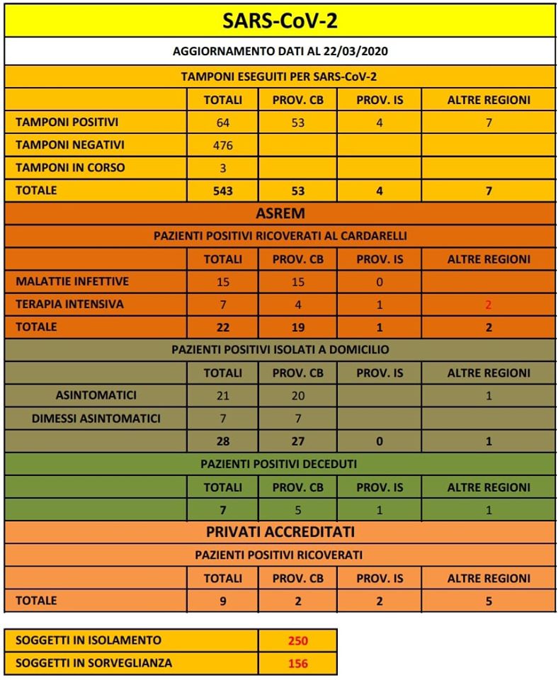 In Molise i positivi al Covid-19, al momento, sono 52 per un totale di 66 (compresi i due trasferiti da Bergamo) dall’inizio dell’epidemia, considerando i 7 guariti e i 7 decessi. 24 sono ricoverati con sintomi, 7 si trovano in terapia intensiva, 21 in isolamento domiciliare. 543 i tamponi effettuati. 250 le persone in isolamento, 156 in sorveglianza.