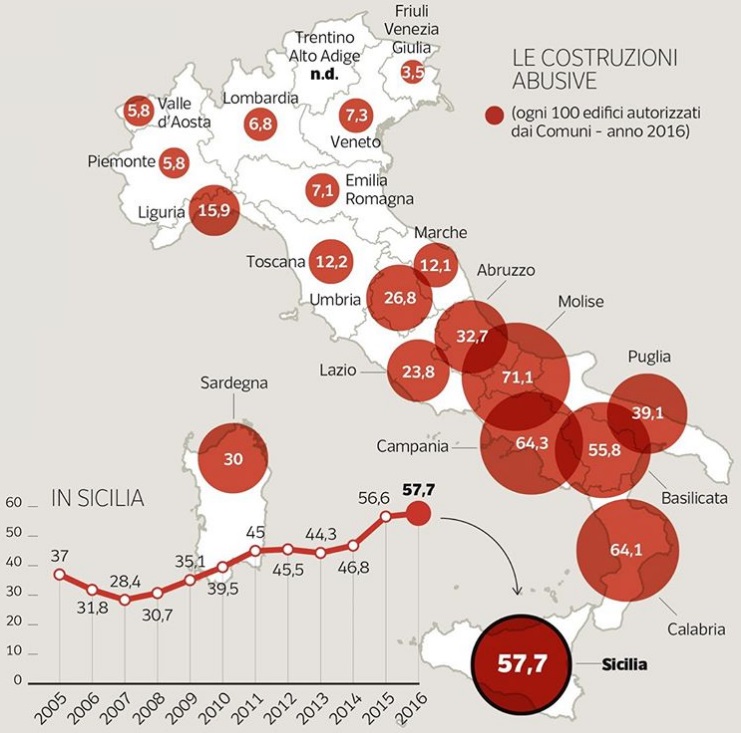 Settantuno edifici su cento in Molise sono abusivi. Il dato è emerso da un’inchiesta del Corriere della Sera, realizzata da Gian Antonio Stella, il quale mette in evidenza come in Italia l’abusivismo edilizio sia dilagante, soprattutto nel Meridione.