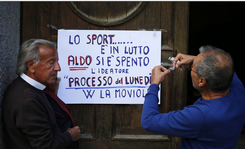 “Lo sport… è in lutto Aldo si è spento. L’ideatore del processo del Lunedì. W la moviola”. È questa la scritta riportata su un cartello bianco apposto dinanzi la chiesa Pio X, a piazza della Balduina a Roma, dove questo pomeriggio, lunedì 9 ottobre, si sono tenuti i funerali di Aldo Biscardi. Il giornalista sportivo molisano che era stato capace, con la sua verve, di farsi apprezzare nel suo lavoro e far conoscere il Molise in tutta Italia.
