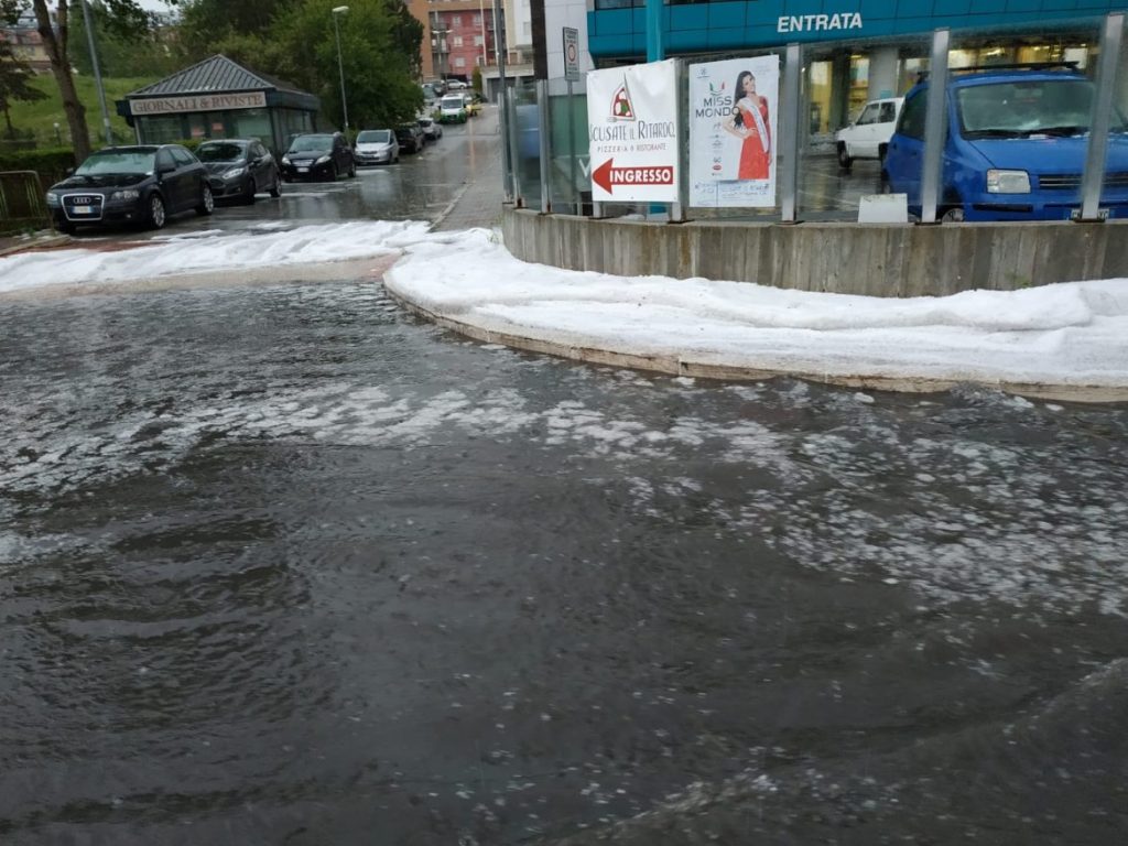 Nella città di Campobasso, dove da poco si è abbattuto un forte temporale, in alcuni tratti della città i marciapiedi sono stati imbiancati dalla grandine.