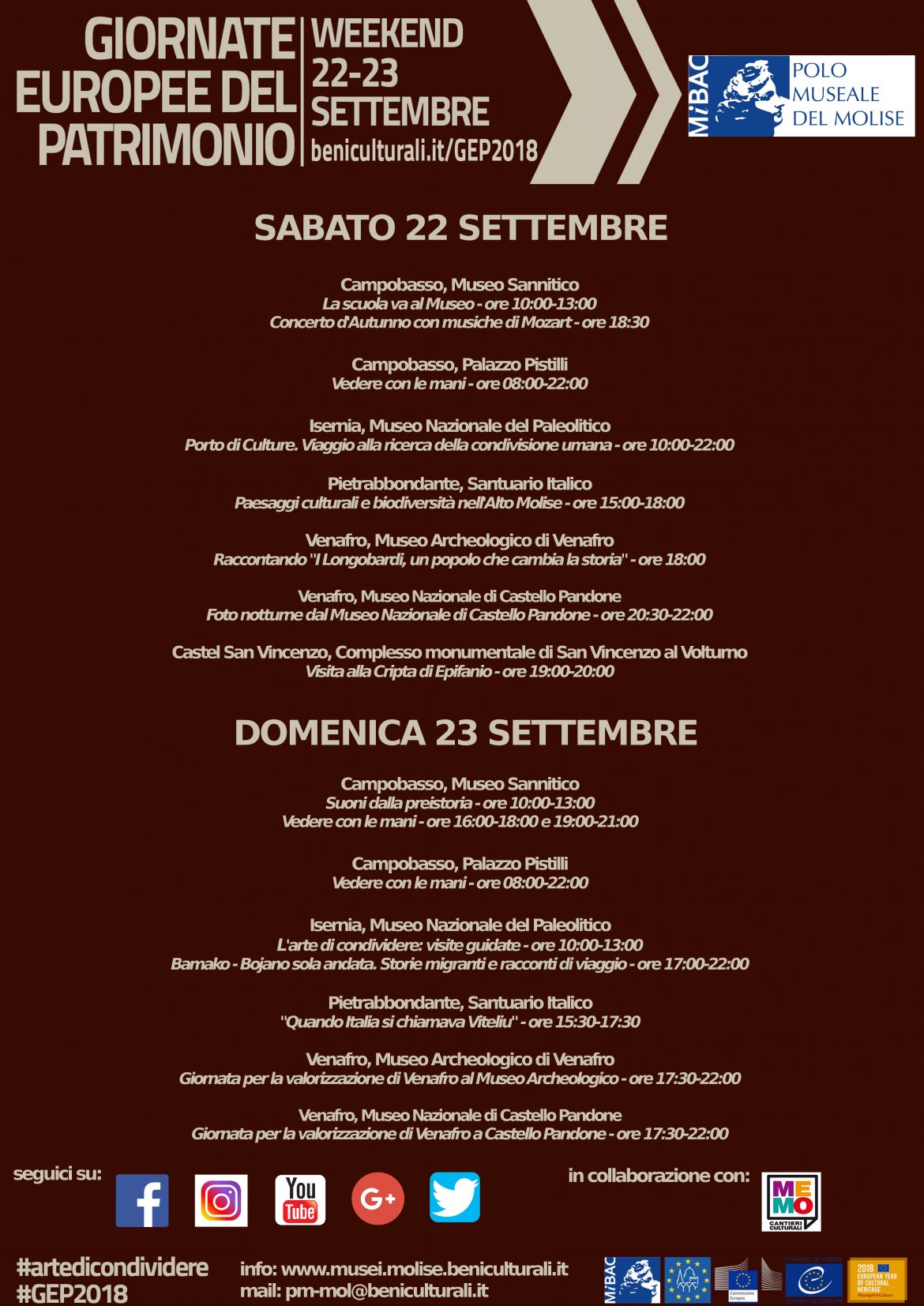 Il tema proposto per l’edizione 2018 nelle giornate del 22 e 23 settembre è l’Arte di condividere. Con lo spirito rivolto anche alle finalità dell’Anno europeo del Patrimonio culturale 2018, il Polo museale del Molise, per dare visibilità al patrimonio regionale, aderisce all’iniziativa promossa dal Ministero per i beni e le attività culturali con un ricco programma di appuntamenti: incontri, concerti, laboratori, visite guidate, nei musei e luoghi della cultura statali ad esso afferenti, cui si accederà con orari e costi ordinari nel corso delle due giornate; al costo simbolico di un euro per la sera di sabato 22 settembre e con biglietto d’ingresso a tariffa ridotta per la sera di domenica 23 settembre.
