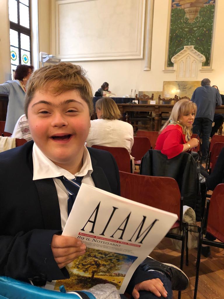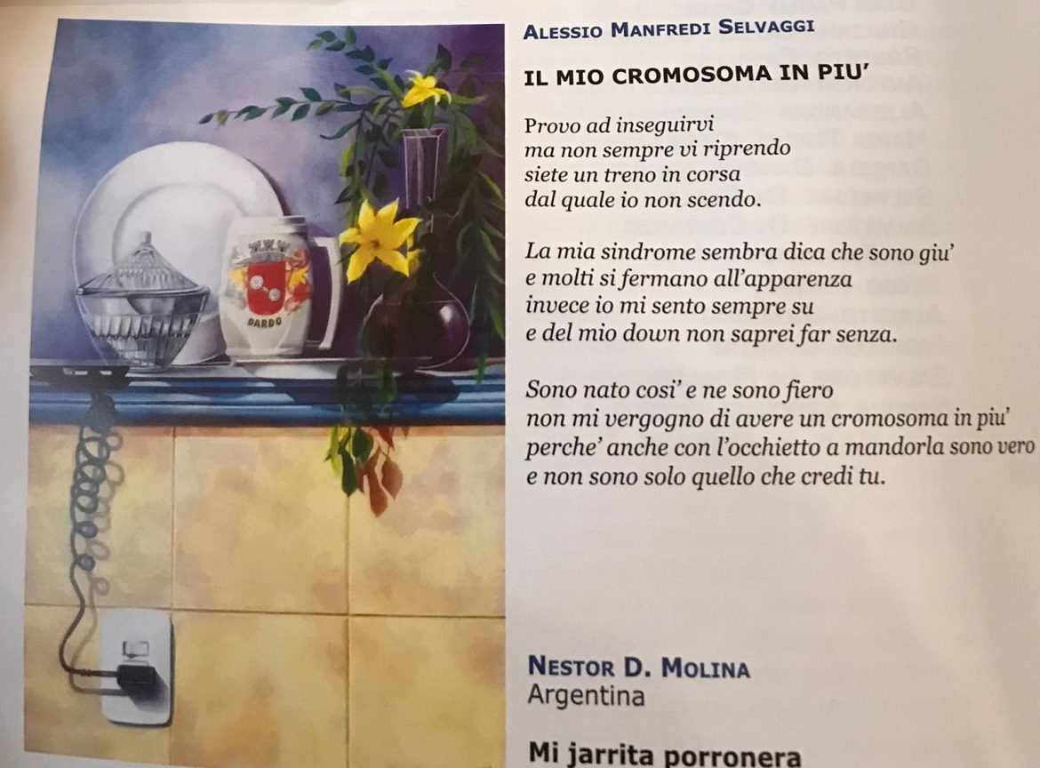 Nell’affollatissima Aula Magna della Università Valdese in Roma, che gli ha tributato applausi ripetuti e lunghissimi, Alessio ha raccontato di sé in una poesia dal titolo “Il mio cromosoma in più”, nella quale con rime semplici, lette da una attrice teatrale romana (unica poesia letta nel corso della manifestazione), parla della fatica di rincorrere i suoi coetanei e la bellezza più che la fatica di essere una persona speciale. Quattordici anni, in procinto di sostenere gli esami di terza media, Alessio si è sempre distinto per simpatia e capacità di superare ogni barriera.