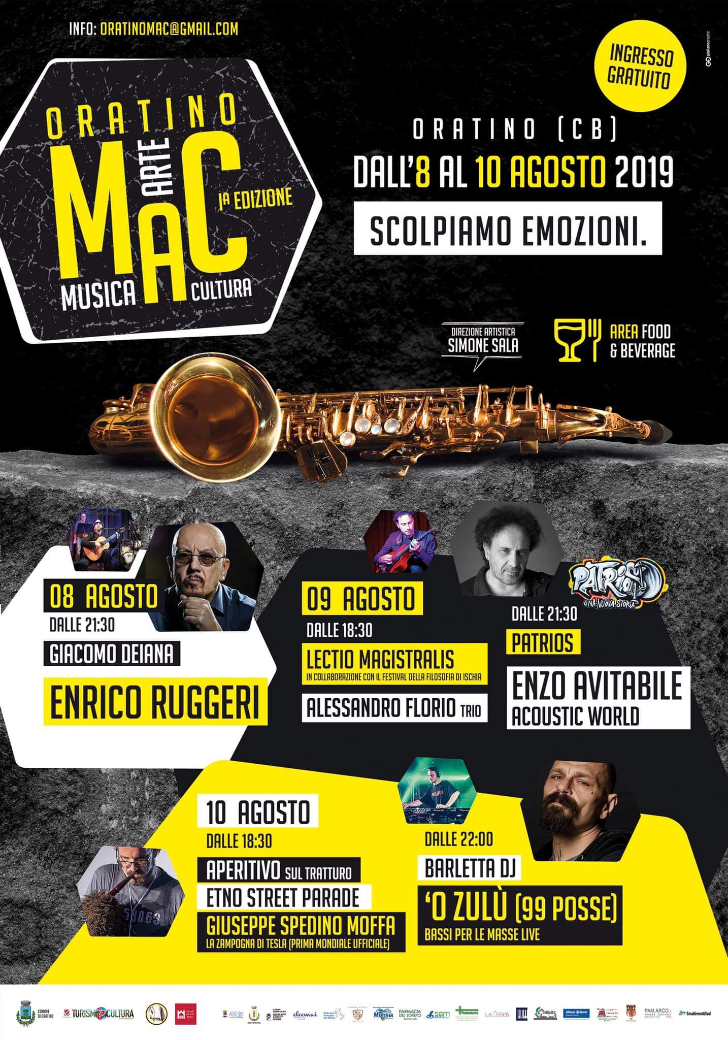 Prende il via giovedì 8 agosto 2019 l’attesa kermesse musicale ‘Oratino MAC’, evento nato da un’idea dell’amministrazione comunale di Oratino, supportata dall’assessorato alla Cultura della Regione Molise col brand ‘Turismo è Cultura’. Direzione artistica affidata al musicista molisano Simone Sala, 37enne pianista dalla grande esperienza a livello nazionale e internazionale.