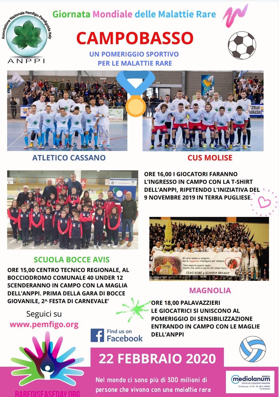 Campobasso si unisce agli eventi della Giornata Mondiale delle Malattie Rare, che si celebra sabato 29 febbraio 2020, quest’anno dal tema ‘Equità per i malati rari e le loro famiglie’. Una settimana prima, sabato 22, il capoluogo molisano sarà protagonista di un’iniziativa organizzata dall’Associazione Nazionale Pemfigo/Pemfigoide Italy.