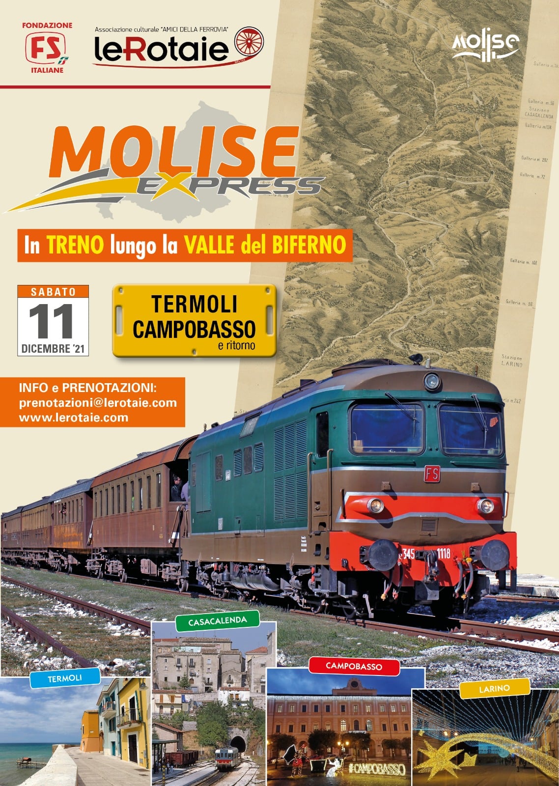Sabato 11 dicembre 2021, con partenza alle 9.30 da Termoli, un convoglio storico di Fondazione FS Italiane composto da carrozze Terrazzini e Centoporte percorrerà la tratta che attraversa la provincia di Campobasso lungo la valle del Biferno risalendo verso il valico di Campolieto, facendo tappa al mattino a Casacalenda per l’accoglienza della comunità locale e per visitare il paese sede del MAACK – Museo all’aperto d’arte contemporanea Kalenarte, con successiva sosta a Campobasso e poi, ripartendo dal capoluogo molisano, con le luci della sera, giungerà a Larino per le suggestive luminarie artistiche di Natale nel centro storico.