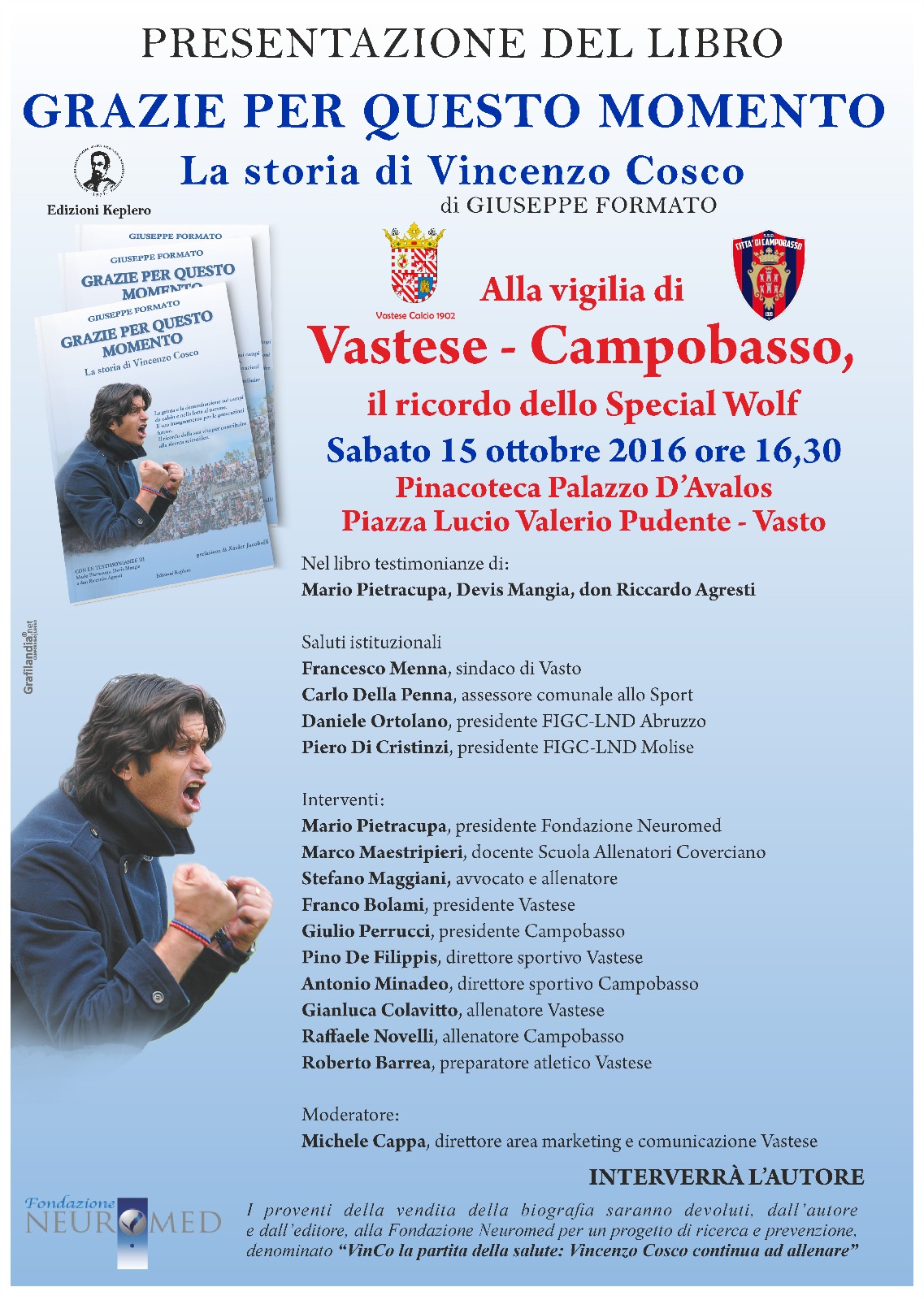 “L’idea della biografia di Vincenzo Cosco – ricorda il giornalista Giuseppe Formato – è nata quando il mister stava vivendo la parte più intensa della sua carriera di allenatore. Ne abbiamo parlato tante volte e nostra intenzione era quella di pubblicarla qualora lo Special Wolf fosse riuscito a esordire almeno in serie B. È del periodo più difficile della sua vita terrena, invece, la sua idea di pubblicarla postuma, attribuendole un significato particolare. Anzi, il libro fornirà diversi significati, che i lettori stanno scoprendo con la lettura delle tantissime copie che si stanno vendendo in tutta Italia. Ha voluto legare la sua storia alla Fondazione Neuromed quando ha capito che la malattia stesse prendendo il sopravvento. Voleva contribuire con un gesto, una goccia nell’oceano, ad aiutare la prevenzione e la ricerca scientifica, per trovare le cure alle tante malattie rispetto alle quali ancora si trovano le soluzioni. Il ricordo più bello di questa fase è il calore che sto trovando in giro per l’Italia, segno questo che Vincenzo Cosco è ancora amato da parte dei tifosi che lo hanno conosciuto come uomo, prima ancora che come allenatore di calcio”.