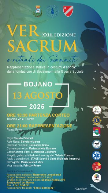 Un atto collettivo e iniziatico, che sanciva il rapporto inscindibile tra uomo, divinità e natura. Bojano, erede di quella memoria ancestrale, si appresta dunque a trasformarsi in palcoscenico corale, animato da cortei in costume, danze rituali, musiche arcaiche e narrazione storica. L’evento avrà inizio alle ore 18:30 con la partenza del corteo da Traversa Via G. Pallotta, per poi culminare alle 21:00 in Piazza Roma, con la rappresentazione centrale ispirata al rito fondativo. Alla regia vi sarà Claudia Patricelli, affiancata da Salvatore Manna, Piermarino Spina alla direzione musicale, Mariantonietta Romano come consulente storica e Clementina Columbo per il coordinamento artistico. Le scene saranno curate da Valeria Romano, mentre le luci saranno affidate a Michele Innocenzi / Stage Sound & Light. Le coreografie, infine, saranno firmate da Mariaclaudia Fatica, e la voce narrante sarà quella di Fabrizio Russo.