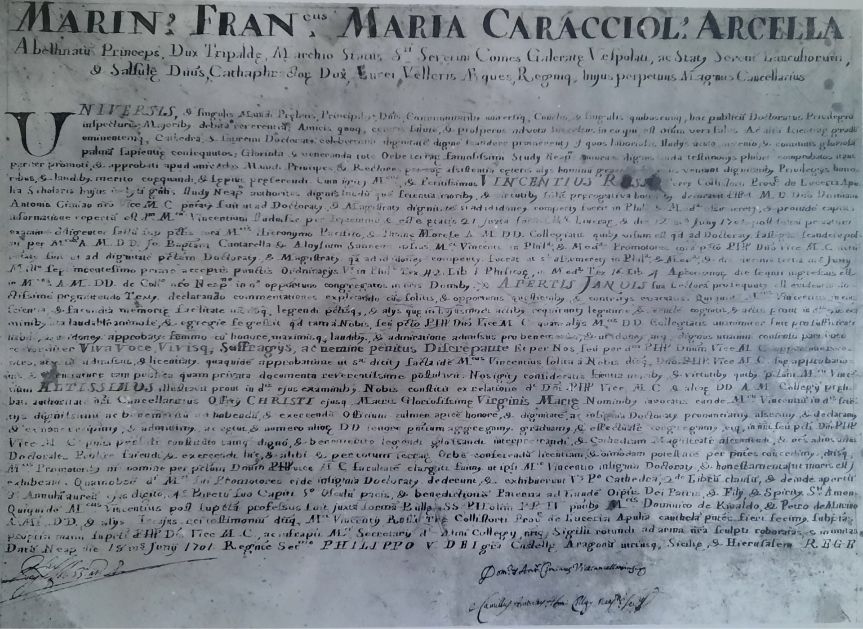 Con orgoglio e un attaccamento particolare giustamente ci viene mostrata questa magnifica copia di laurea dell’Università di Napoli. Va detto che, unitamente alle altre fonti materiali rinvenute recentemente a seguito della ricostruzione post sisma, il suo contenuto chiarisce non poche cose su un angolo del borgo, noto a tutti col nome Campo di Fiori. Il documento è scritto a mano con i caratteri dell’epoca. La formula di rito è in lingua latina. L’intestazione campeggia a caratteri maiuscoli: “MARIN(US) FRAN(CISCUS) MARIA CARACCIOL(US) ARCELLA Abellinatum Princeps, Dux Atripald(ae), Marchio Status S(anc)ti Severini, Comes Galerat(ae) (…) UNIVERSIS Singulis Mundi Praelatis, Principb(us), D(omi)nis Communitatib(us) universi(que) cunc(ep)tis, singulis quibus cumq(ue), hoc publicu(m) Doctoratus privilegiu(m) inspecturis Majorib(us) debita(m) reverentia(m) (…) Cum igit(ur) M(agnifi)cus, Peritissimus VINCENTIUS ROSSI Terr(ae) Collistorti Provinc(ae) de Luceria Apulia (…) in Phil(osophia) et in Med(icina) (…) Anticamente il medicus phisicus era colui che conseguiva la laurea in Medicina e Filosofia.