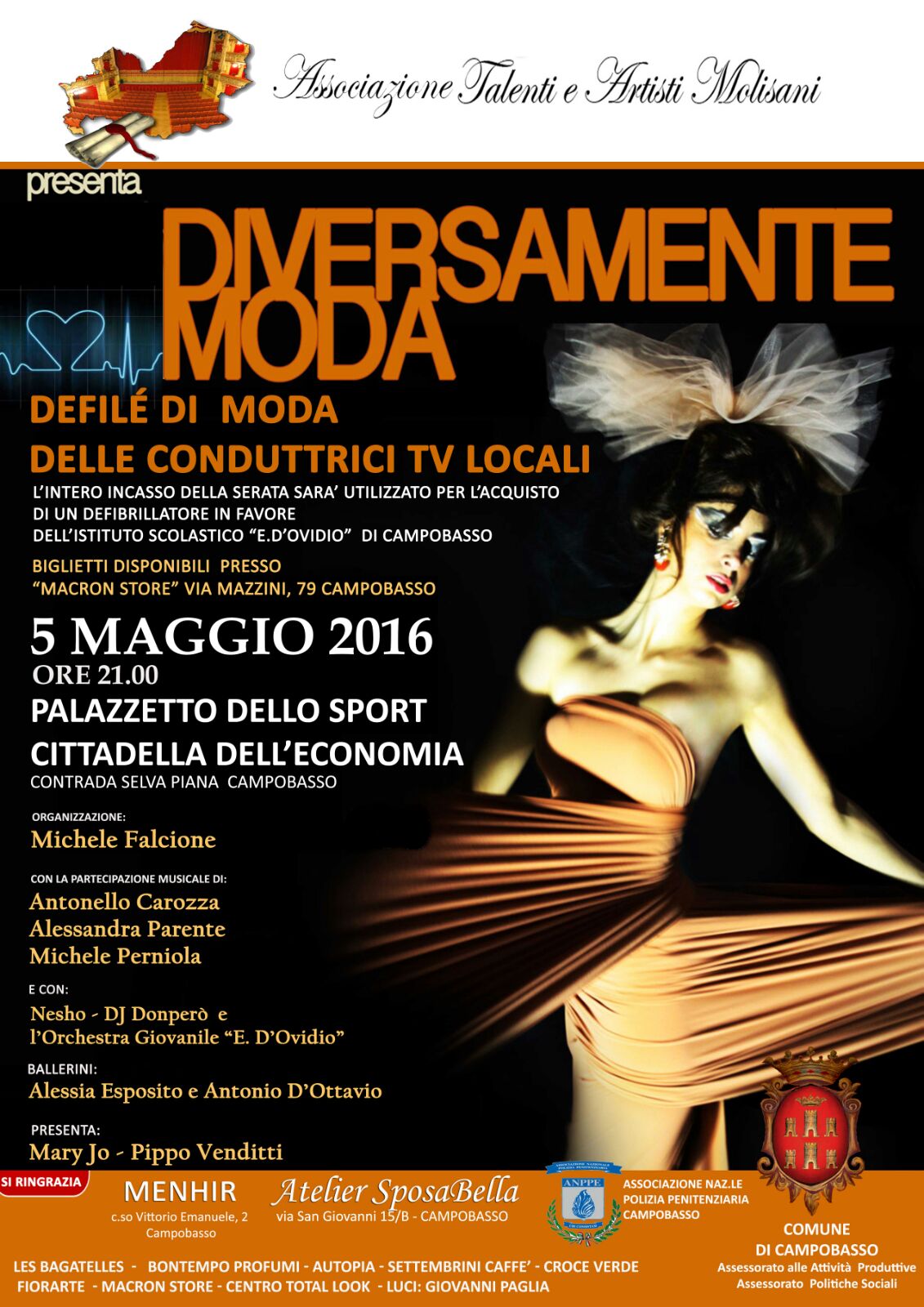 IMG-20160415-WA0018Poter donare un defibrillatore all’Istituto scolastico Francesco D’Ovidio di Campobasso. È questo lo scopo benefico della sfilata di moda nata da un’idea dell’Associazione Talenti e Artisti Molisani e promossa insieme al Comune di Campobasso, assessorato alle Attività Produttive e assessorato alle Politiche Sociali. A patrocinare la manifestazione anche l’Associazione Nazionale Polizia Penitenziaria di Campobasso.