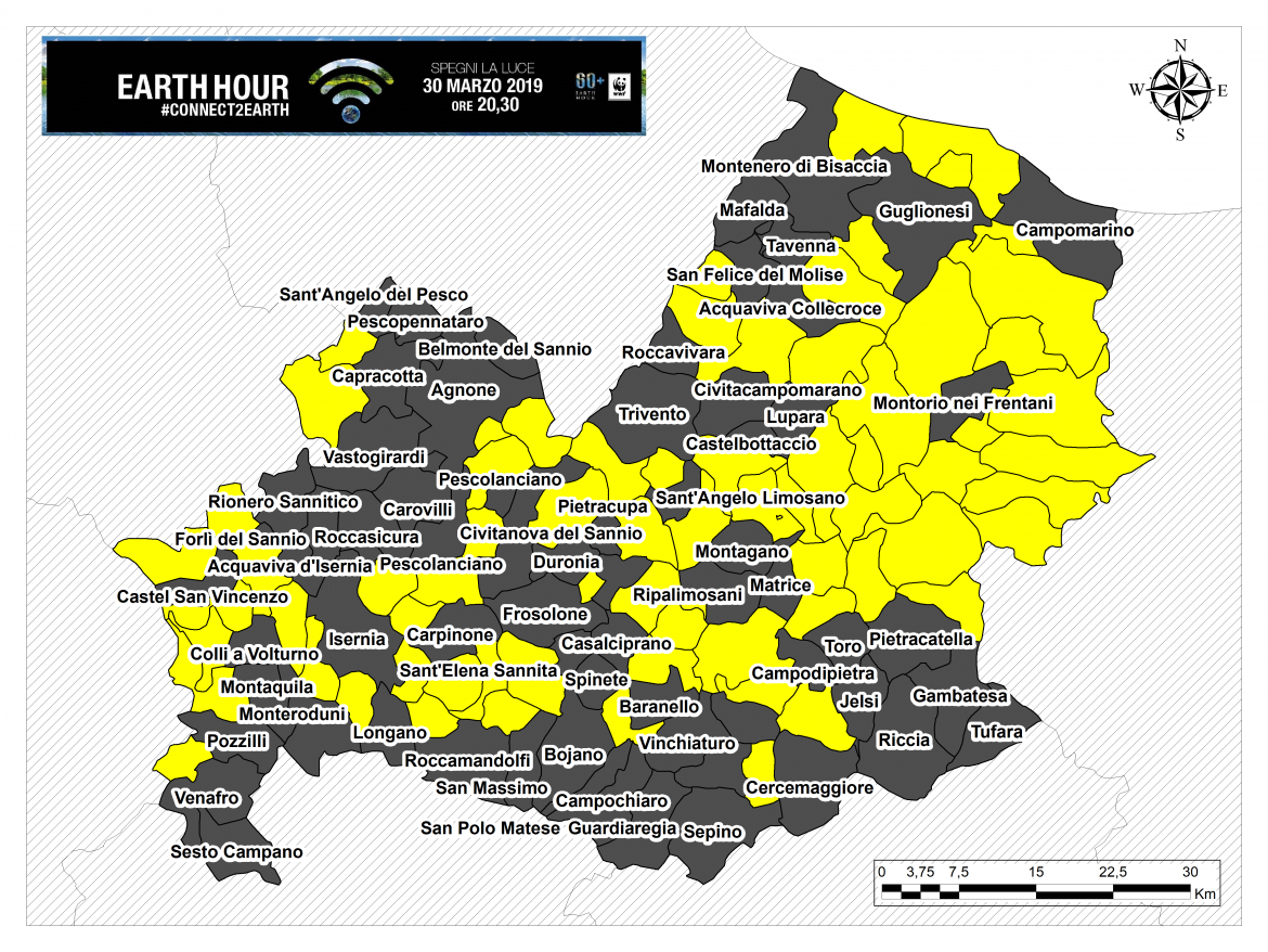 Di seguito alcuni dei luoghi che verranno spenti simbolicamente: la Fontana Fraterna a Isernia, il Castello Caldora a Carpinone, Piazza Santa Maria a Mare a Campomarino, il Castello Medievale a Riccia e il Castello di Pescolanciano, la Chiesa di Sant’Anastasio Martire ad Acquaviva Collecroce, Piazza Nerazio Prisco a Sepino, la Palazzina Liberty a Venafro, la Chiesa Madre a Sant’Angelo Limosano, il Campanile della Chiesa di Santa Maria di Costantinopoli a San Felice del Molise e la Chiesa di San Giacomo Apostolo a Pietracatella. Tutti gli spegnimenti sono visibili sul sito oradellaterra.org.