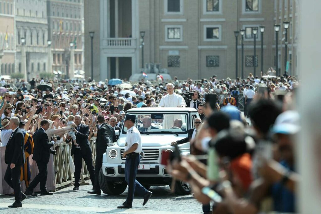 Il giorno si annuncia caldissimo fin dalle prime ore del mattino, ma in Piazza San Pietro i fedeli sono circa 40mila in occasione della tradizionale udienza generale del mercoledì.