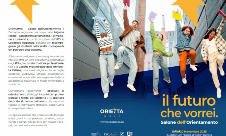 La Regione Molise – Assessorato all’Istruzione, Formazione e Università, con il patrocinio dell’Ufficio Scolastico Regionale del Molise, promuove il progetto “OrientaMolì”, un’importante iniziativa regionale dedicata all’orientamento formativo e professionale dei giovani molisani, con l’obiettivo di accompagnarli nella costruzione consapevole del proprio percorso post-diploma.