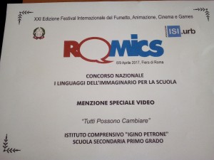 Il concorso, a cui hanno partecipato oltre cento scuole italiane di ogni ordine e grado, si proponeva di invitare le giovani generazioni, a riflettere, attraverso il fumetto, l’illustrazione, l’animazione e i games, sulle tematiche che affliggono il nostro tempo: la legalità, il rispetto delle regole, lo sviluppo sostenibile, il contrasto alle discriminazioni di ogni genere, il bullismo, perché, come ha sottolineato il ministro Fedeli, sul palco della premiazione: “La creatività messa a disposizione della comunicazione è una delle cose più importanti. Utilizzare le arti visive per raccontare quello che vivono ogni giorno mandando un messaggio positivo, questa è scuola oltre la scuola”. E gli alunni della 3^ E hanno voluto lanciare un messaggio forte, soprattutto ai loro coetanei, scegliendo di lavorare sul tema del bullismo attraverso la realizzazione di un video che non solo ha ricevuto una menzione speciale nella categoria ‘Video’, ma anche i complimenti personali del ministro, che lo ha potuto guardare nell’area Mostre della Fiera, dedicata ai grandi ospiti della Rassegna internazionale, dove verrà proiettato insieme alle altre opere vincitrici per tutta la durata del Festival.
