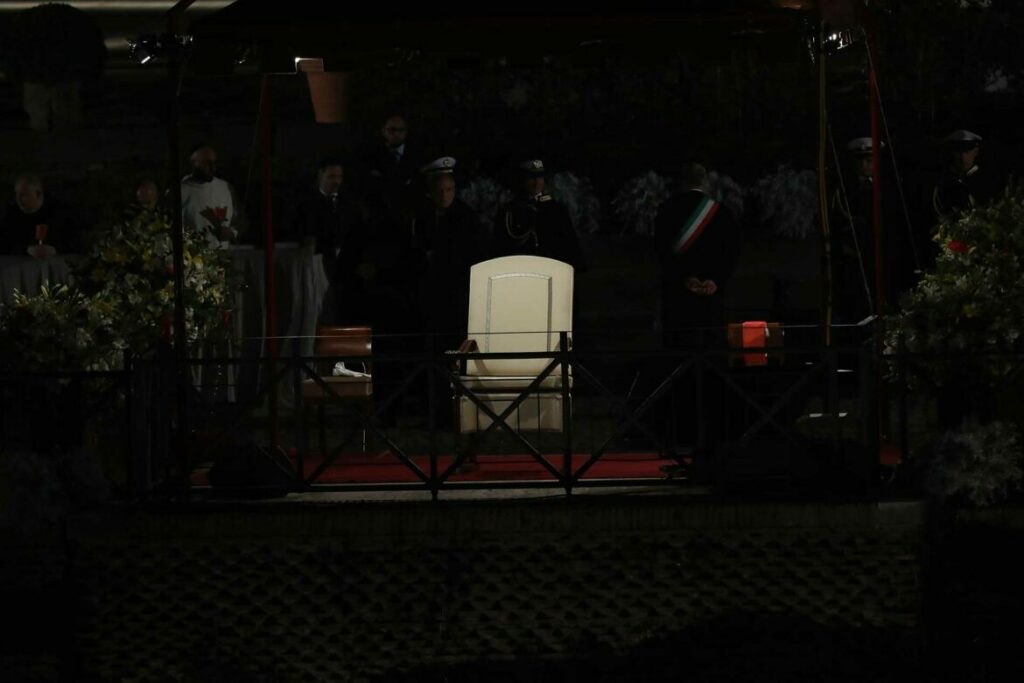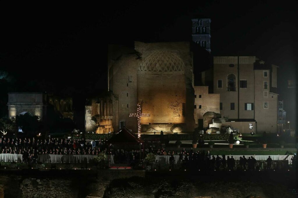 Alle 21.00 la Via dei Fori Imperiali e il Colosseo si accendono di luci, fiammelle, preghiere, quando ad un certo punto, mentre tutti gli operatori hanno gli obiettivi e le telecamere puntate sulla postazione del Colle Palatino, la poltrona del Santo Padre viene improvvisamente portata via. Arriva il messaggio della sala stampa, il Papa non ci sarà. Deve preservare la salute per la veglia e la messa Pasquale.