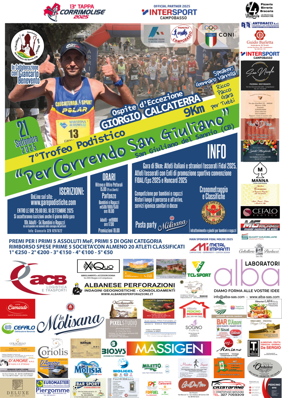 Un mese esatto ed il 21 settembre sarà grande festa a San Giuliano del Sannio grazie alla caparbietà di Giancarlo Benevento. Una data importante per lo sport, ma, al tempo stesso, sarà una data importante per il paesino dell’entroterra molisano, perché segnerà la settima edizione del Trofeo Podistico “PerCorrendo San Giuliano”. gara podistica sulla distanza di 9 chilometri (iscrizioni su www.garepodistiche.com Pizzano Pasquale) – fortemente voluta e organizzata da Giancarlo Benevento in collaborazione con l’Associazione I Fucilieri di San Nicola di San Giuliano del Sannio, il patrocinio del Comune di San Giuliano del Sannio (CB), la collaborazione tecnica dell’Associazione Sportiva Dilettantistica “Podistica AVIS Campobasso”, della Fidal Molise e Comitato Regionale CONI. Quest’anno la kermesse podistica sarà 13^ tappa del Gran Prix Corrimolise (Fidal marchiata InterSport-Metal Impianti).